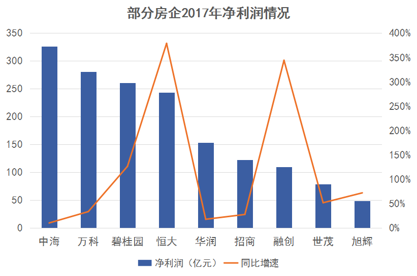根據(jù)近期上市公司發(fā)布的年報,千億以上規(guī)模的房企于2017年均實現(xiàn)了不同程度的凈利潤增長,中海凈利潤為人民幣325.8億元,同比增長10%;萬科實現(xiàn)凈利280.52億元,同比增長33.44%。此外,恒大、融創(chuàng)凈利潤增幅達到數(shù)倍。