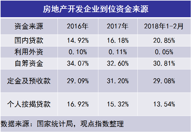 國家統(tǒng)計局數(shù)據(jù)顯示,2018年1至2月,房地產(chǎn)開發(fā)企業(yè)到位資金2.4萬億元,同比增長4.8%,增速較去年回落3.4個百分點。按來源分,房企的國內(nèi)貸款增速0.3%,較去年回落17個百分點,但占比仍持續(xù)上升。