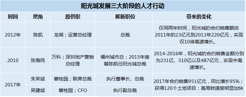 在這個(gè)關(guān)口,一般也是房企沖刺千億的奮進(jìn)時(shí)刻,陽(yáng)光城則顯得更加干脆:2017年挖來(lái)碧桂園的“雙斌”組合,同年陽(yáng)光城合約銷售逼近千億,實(shí)現(xiàn)951億元。需要注意的是,碧桂園就是在476億元銷售額的關(guān)口,一年內(nèi)躍升到了千億以上。