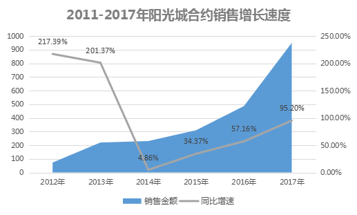回顧過(guò)往,陽(yáng)光城的發(fā)展階段約莫可以分為三大階段:一個(gè)是銷售業(yè)績(jī)僅為兩位數(shù)的沉寂階段,即2012年以前;第二個(gè)是實(shí)現(xiàn)近10倍高速增長(zhǎng)的2012年-2014年;接著是進(jìn)入相對(duì)穩(wěn)定的中高速發(fā)展時(shí)期,2015年-2016年,在3年的時(shí)間里陽(yáng)光城的銷售金額已經(jīng)來(lái)到近500億元。