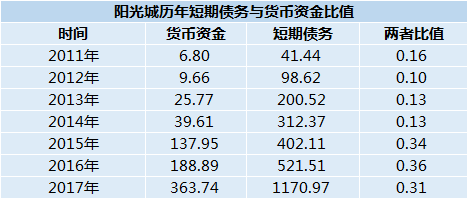 不過(guò),正如朱榮斌所言,進(jìn)擊的陽(yáng)光城就好比“天天大吃大喝”,最后想要沒(méi)有三高,是很難做的。觀點(diǎn)指數(shù)研究發(fā)現(xiàn),對(duì)比過(guò)去的2011-2014年,雖然2017年陽(yáng)光城貨幣現(xiàn)金對(duì)短期負(fù)債的覆蓋率有所提升,為0.31,但是和過(guò)往兩年相比還是有所下降。