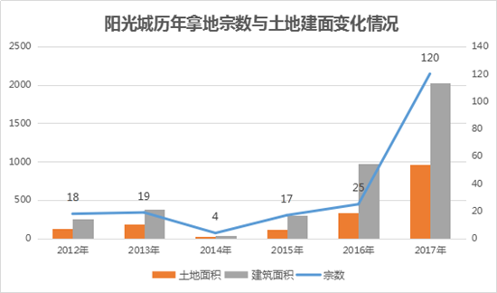 隨著“雙斌”的到來(lái),陽(yáng)光城開(kāi)始呈現(xiàn)“碧桂園式”發(fā)展路線:2017年,陽(yáng)光城實(shí)現(xiàn)合約銷售951億元,同比增長(zhǎng)95%;獲取土地項(xiàng)目達(dá)到120個(gè)。