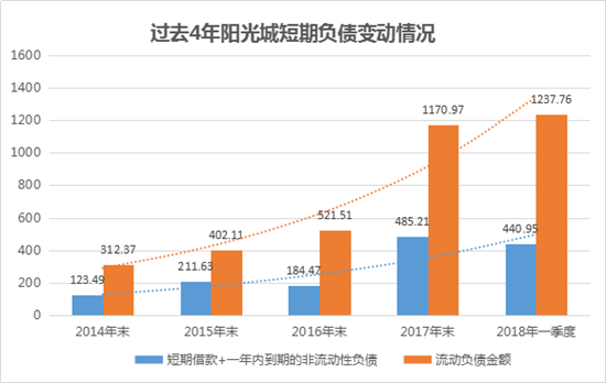 短期負(fù)債總額方面,2017年末陽(yáng)光城的短期負(fù)債總額為1170.97億元,同比增長(zhǎng)124.53%,其中短期借款和一年內(nèi)到期的非流動(dòng)性負(fù)債和約485.21億元,同比增長(zhǎng)163%。截止2018年一季度,陽(yáng)光城的短期負(fù)債為1237.76億元。