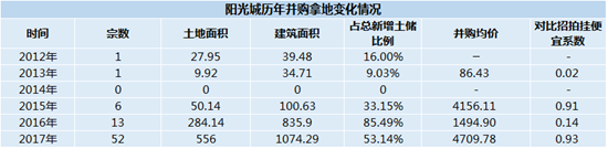 而“雙斌”給陽(yáng)光城的并購(gòu)動(dòng)作卻顯得更為堅(jiān)決一些:2017年,陽(yáng)光城拿地金額為1396.37億元,剔除合作以及補(bǔ)容積率的項(xiàng)目外,用于并購(gòu)的金額為505.97億元,超過(guò)招拍掛市場(chǎng)的480.45億元。