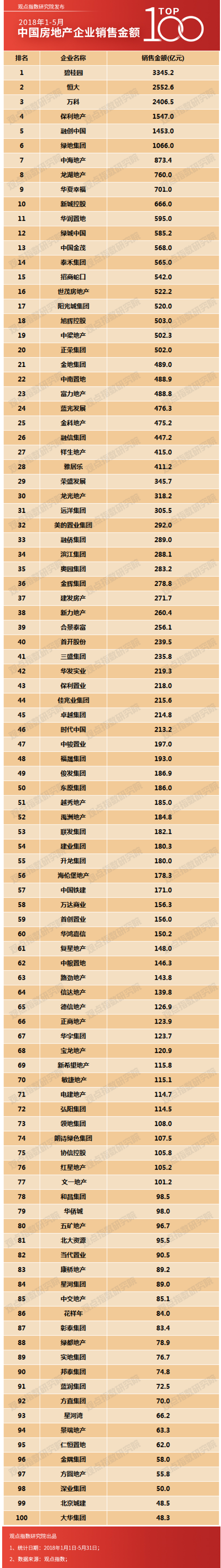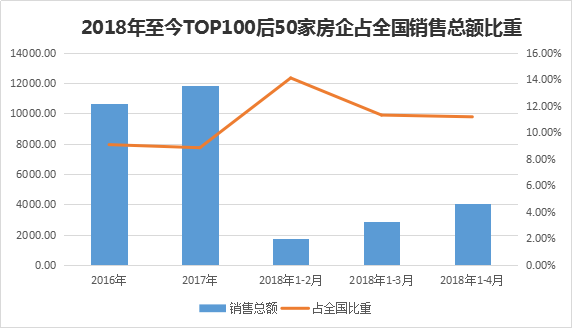 反觀TOP51-TOP100的50家房企,2018年1月的銷售總額為958.63億元,累計前四月的銷售總額為4047.18億元。50家房企的銷售總額還落后前三強幾千億元。