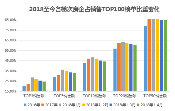 從各梯次銷售總額占全國的銷售比重來看,TOP3、TOP5的變動最大,由2016年的8.9%、12.85%分別上浮至2018年前四個月的18.38%以及24.75%。這也意味著,排名前5的企業(yè)已占據(jù)全國近1/4的銷售額,整個行業(yè)向“寡頭時代”邁進。