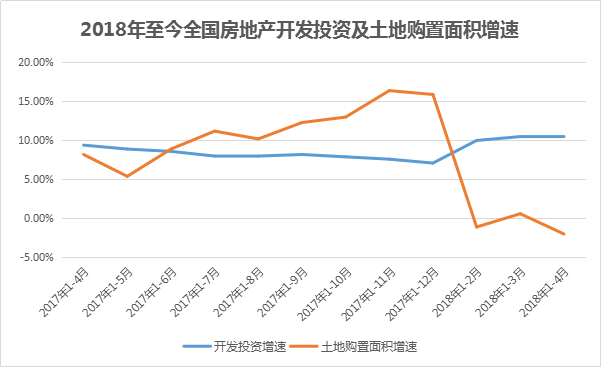 從國家統(tǒng)計局發(fā)布的數(shù)據(jù)來看,和2017年房地產(chǎn)行業(yè)土地購置面積同比增速均為正數(shù)或者雙位數(shù)增長不同,進入2018年該數(shù)值已經(jīng)轉(zhuǎn)為負數(shù),其中2018年1-2月累計的土地購置面積增速為-1.2%,1-3月份增長速度為0.5%。不過僅一個月后就又轉(zhuǎn)為負數(shù),1-4月份房地產(chǎn)開發(fā)企業(yè)土地購置面積5412萬平方米,同比下降2.1%。