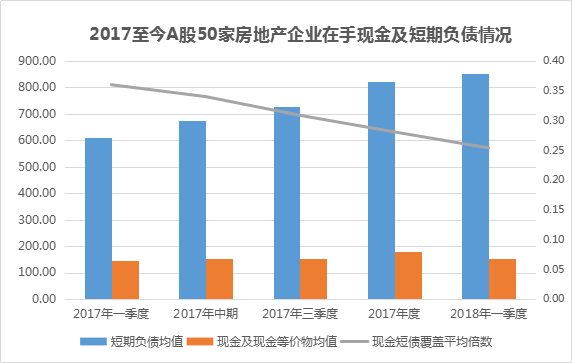 分季度來觀察,2017年一季度50家A股企業(yè)的短期負債均值為611.27億元,爾后該數(shù)值逐季上升,分別為676.34億元、727.83億元、823.13億元,至2018年一季度已經(jīng)來到853.77億元。