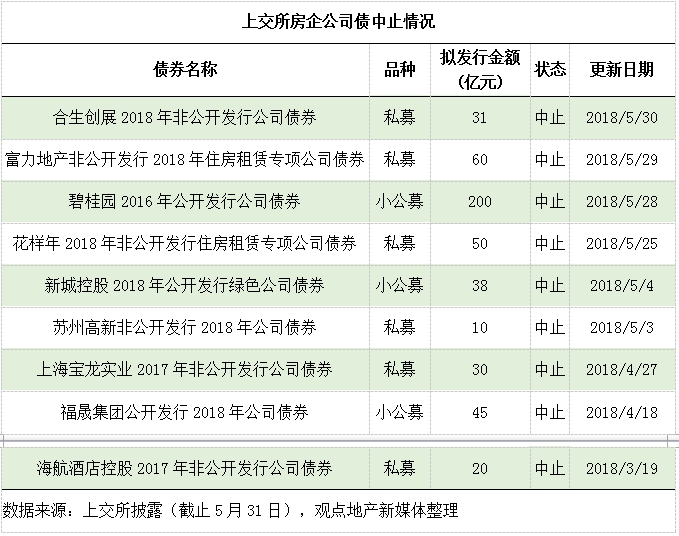 觀點新媒體不完全統(tǒng)計,截止5月31日,2018年內(nèi)上交所已累計有9家房企被中止發(fā)行公司債,涉及擬發(fā)債規(guī)模484億元,其中碧桂園占比近一半。