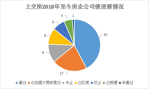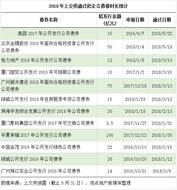 總體而言,從上交所審核的公司債情況看,2018年前五個月共有約78筆房企公司債在申請發(fā)行,其中通過的有33筆,占比不足一半;剩余暫未通過的有38筆,未通過或終止的有7筆,包括寶能旗下深業(yè)物流20億元小公募債。