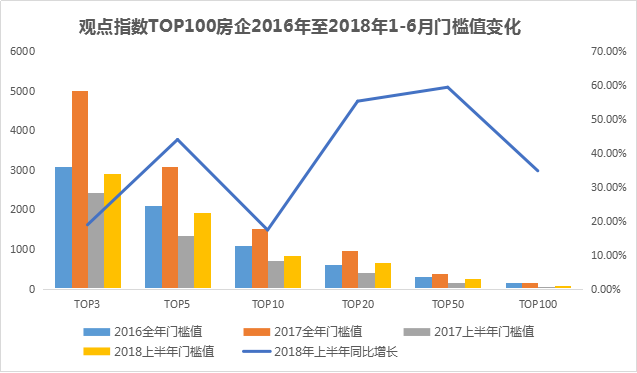 具體而言,2017年上半年TOP3、TOP5、TOP10、TOP20、TOP50以及TOP100的門檻值分別為2440.9、1330.96、703.4、420、160以及50.02億元,時隔一年上述門檻值均進一步提升。其中,同比增長速度最大的主要為TOP5、TOP20、TOP50,同比增速達到40%以上。