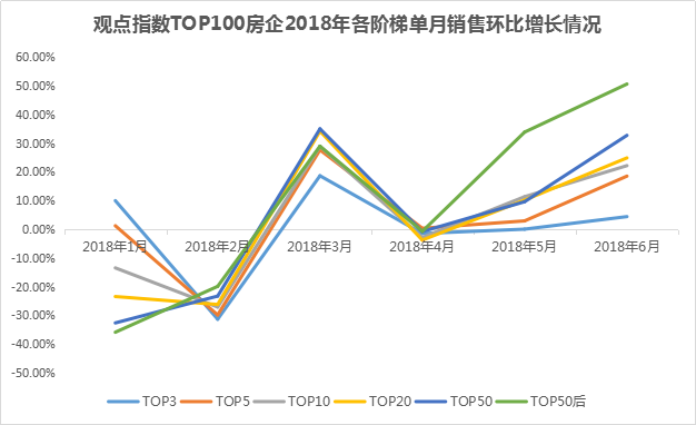 從每個層級來觀察,除2月外,TOP5房企在過去6個月中基本保持環(huán)比正增長,其中增長速度最快的是在3月,增長速度為27.62%;其次,在所有階梯房企中,環(huán)比增長速度最大的出現(xiàn)在3月,被TOP50房企奪得,同比增速超過50%。同樣可以注意到的是,2018年5月,在其他階梯房企均表現(xiàn)平平時,TOP50后房企逆市上揚,錄得33.83%的優(yōu)異增長表現(xiàn)。