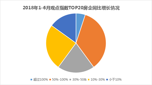 從“觀點指數(shù)·2018年上半年中國房地產(chǎn)企業(yè)銷售金額TOP100”也可以看到,資金鏈承壓的現(xiàn)實下,房企去化意愿強烈,加速銷貨,實現(xiàn)現(xiàn)金回流。上述銷售20強中,上半年同比增速在50%-100%之間的達到35%,增長率位于10%-30%的房企最多,達到25%。