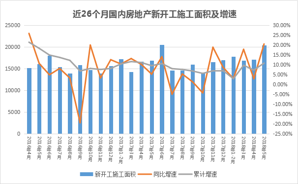 從近26個月的單月數(shù)據(jù)來看,2018年上半年房地產(chǎn)新開工施工面積波動上漲,其中2018年1-2月、3月、4月以及5月的單月同比增速分別為2.95%、17.79%、2.9%和20.5%,累計增速則為2.9%、9.7%、7.3%和10.8%。