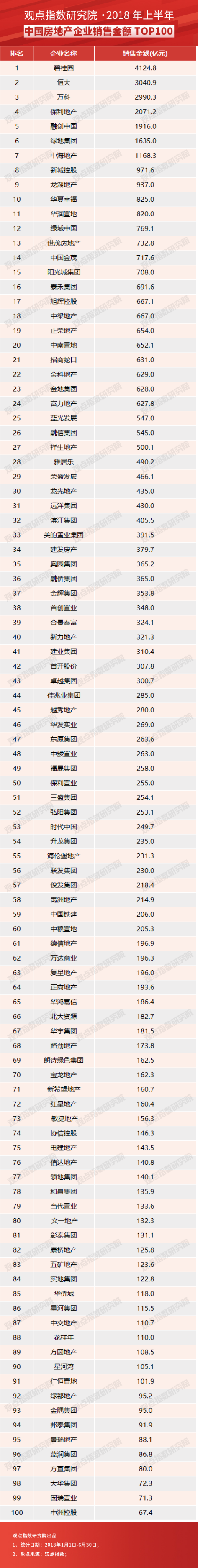 從“觀點指數(shù)·2018年上半年中國房地產(chǎn)企業(yè)銷售金額TOP100”來看,上半年各階梯門檻值均有不同程度上升,反映出不管是各路房企都在努力擴大自己的銷售規(guī)模。