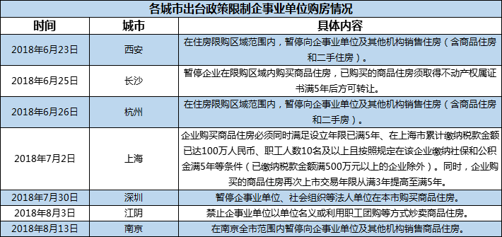 為進(jìn)一步落實(shí)房地產(chǎn)市場(chǎng)調(diào)控要求,8月13日,南京市下發(fā)《關(guān)于調(diào)整我市企事業(yè)單位住房限購(gòu)政策的通知》,明確在南京全市范圍內(nèi)暫停向企事業(yè)單位及其他機(jī)構(gòu)銷售商品住房。至此,南京也成為繼江陰之后,第7個(gè)宣布限制企事業(yè)單位購(gòu)買品房的城市。