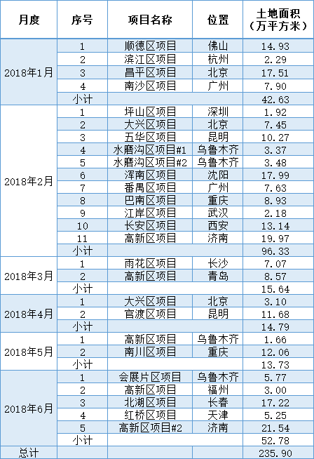 中海2018年上半年新增土儲情況