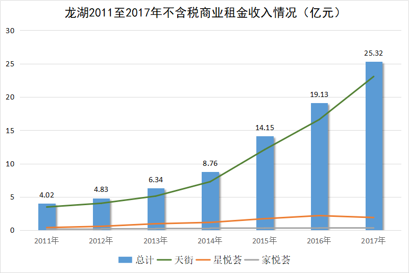 2011年,龍湖把商業(yè)提升至戰(zhàn)略層面;2012年,它明確地列出了商業(yè)項目的3條產(chǎn)品線:天街、星悅薈、家悅薈。此后,在2017年將長租公寓列入投資物業(yè)范疇之前,其租金收入基本都來源于商場。