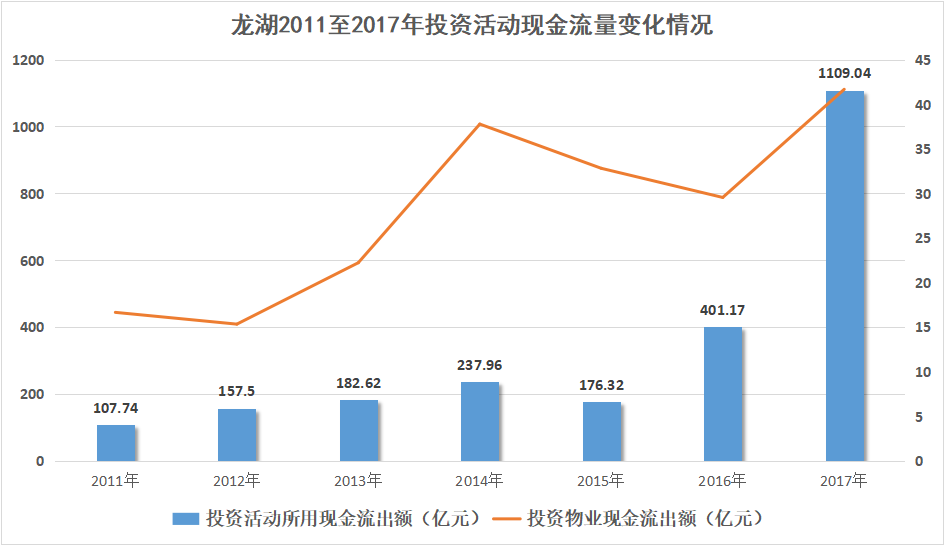近幾年,龍湖投資活動所用的現(xiàn)金流出額在波動中呈增長趨勢;去年,龍湖以1.76倍的增長幅度,將額度提升至1109.04億元。其中,它的投資物業(yè)現(xiàn)金流出額,在前三年連續(xù)下降的情況下,于2017年增長41.06%至41.67億元;這或許與龍湖不斷加持商業(yè)與長租公寓有關。
