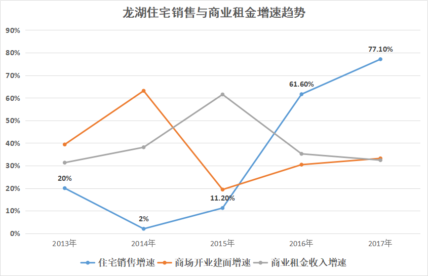 2014年,龍湖住宅業(yè)務的銷售增速跌入谷底,只達到2%;但從2015年開始,它的增速就開始躥升,直到2017年達到77.1%。在此期間,盡管龍湖的商場開業(yè)建面、租金收入增速常有波動,但住宅業(yè)務一直保持著“領頭”的位置。