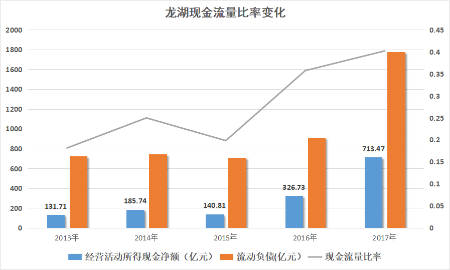 觀點指數(shù)通過計算比較發(fā)現(xiàn),龍湖的現(xiàn)金流量比率(經(jīng)營活動所得現(xiàn)金凈額/流動負債)雖然偶有波動,但2017年仍然上升至0.4,其償債能力以及經(jīng)營活動的“造血”功能有逐漸改善的趨勢。
