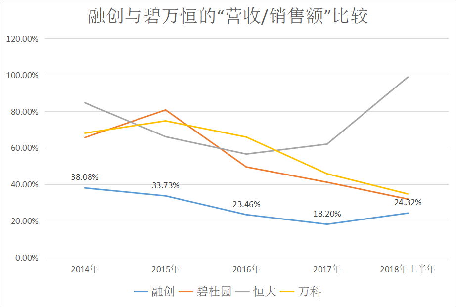 近兩年在融創(chuàng)銷售增速動輒達到一點幾倍的情況下,相對較低的營收銷售比體現(xiàn)了它結轉(zhuǎn)的“節(jié)制”。