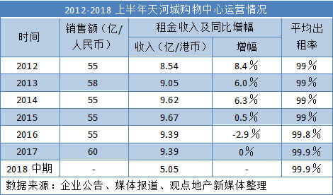 在控股公司粵海投資公布的半年報中,這一情況似乎有所好轉(zhuǎn),2018年上半年,天河城購物中心實現(xiàn)租金收入5.05億港元,在近三年內(nèi)首次實現(xiàn)同比增長,期間平均出租率接近99.9%。