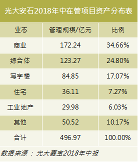 從投資組合構(gòu)成來看,截至2018年中,光大安石的住宅項(xiàng)目比例已降至7.27%,商業(yè)、寫字樓及綜合體的比例占比超過三分之二。