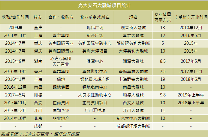 在模式選擇上,目前光大安石采取輕重并舉方式拓展商業(yè)項(xiàng)目。2017年11月,卓越大融城項(xiàng)目正式開業(yè),成為光大安石旗下首個(gè)輕資產(chǎn)輸出項(xiàng)目。