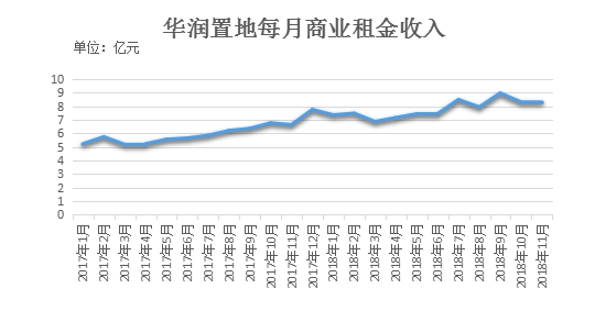 2018年前11個(gè)月中,華潤置地的投資物業(yè)實(shí)現(xiàn)租金收入約85.59億元,其中11月份的租金收入為8.33億元。商業(yè)地產(chǎn)平均每月為公司貢獻(xiàn)7.78億元,而且處于逐步上升的態(tài)勢。其中2018年上半年租金收入的年平均增長率達(dá)到了26.5%。