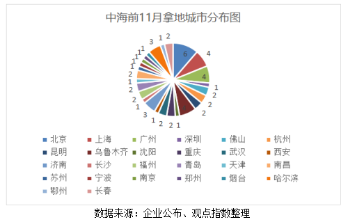 據(jù)觀點指數(shù)了解,前11月,中海共計新增53宗地塊,應(yīng)占樓面面積1126.07萬平方米,應(yīng)付土地出讓金為人民幣780.71億元,主要分布在北京、上海、廣州、武漢、重慶、西安等一二線城市。