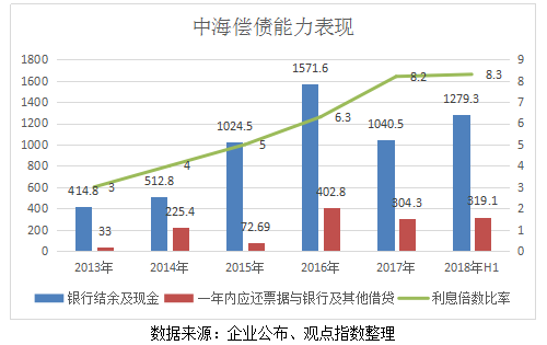 數(shù)據(jù)顯示,截至2018年6月31日,中海銀行結(jié)余及現(xiàn)金為1279.3億港元,一年內(nèi)應(yīng)付票據(jù)與銀行及其他借貸為319.1億港元,利息倍數(shù)比率高達(dá)8.3,無論是短期債務(wù)還是長期償債,均有所依仗。