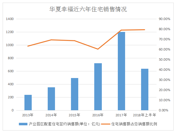 據(jù)觀點(diǎn)指數(shù)統(tǒng)計(jì),2018年全年,華夏幸福在房地產(chǎn)銷售方面錄得銷售金額1660.0億元。而2018年上半年,華夏幸福的產(chǎn)業(yè)園區(qū)配套住宅實(shí)現(xiàn)簽約銷售額638.12 億元,占上半年總銷售額805.04億元的79.27%,2017年,住宅銷售額則占總銷售額的78.87%。