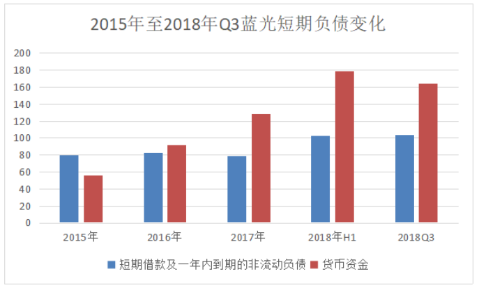 人事之外,更多挑戰(zhàn)因素體現(xiàn)在逐漸走高的財(cái)務(wù)表現(xiàn)上。數(shù)據(jù)顯示,截至2018年9月30日,藍(lán)光流動(dòng)負(fù)債總計(jì)709.74億元,與年初的519.57億元相比增長(zhǎng)36.6%,其中短期借款及一年內(nèi)到期的非流動(dòng)負(fù)債103.9億元,較年初增長(zhǎng)31.62%。而得益于債券的發(fā)行,貨幣資金(包括受限)較年初增長(zhǎng)了28%至163.93億元。
