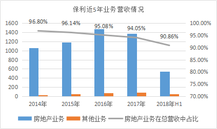 從營收占比方面看,其他業(yè)務(wù)比例占比雖有上升,但截至2018年上半年,保利房地產(chǎn)銷售收入539.37億元,仍占總營收的90.86%。
