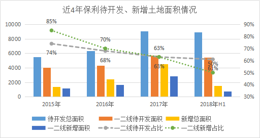 土儲上表現(xiàn)得更為明顯,截至2018年上半年,保利地產(chǎn)總土地儲備為14411萬平方米,其中有55%位于一二線城市;8950萬平方米待開發(fā)土地中,一二線城市占比約61%。