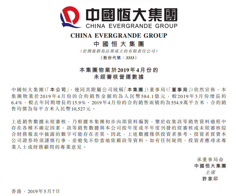 5月7日,中國(guó)恒大(03333.HK)發(fā)布銷售簡(jiǎn)報(bào),其4月實(shí)現(xiàn)銷售額584.1億,環(huán)比增6.4%,同比增15.9%。