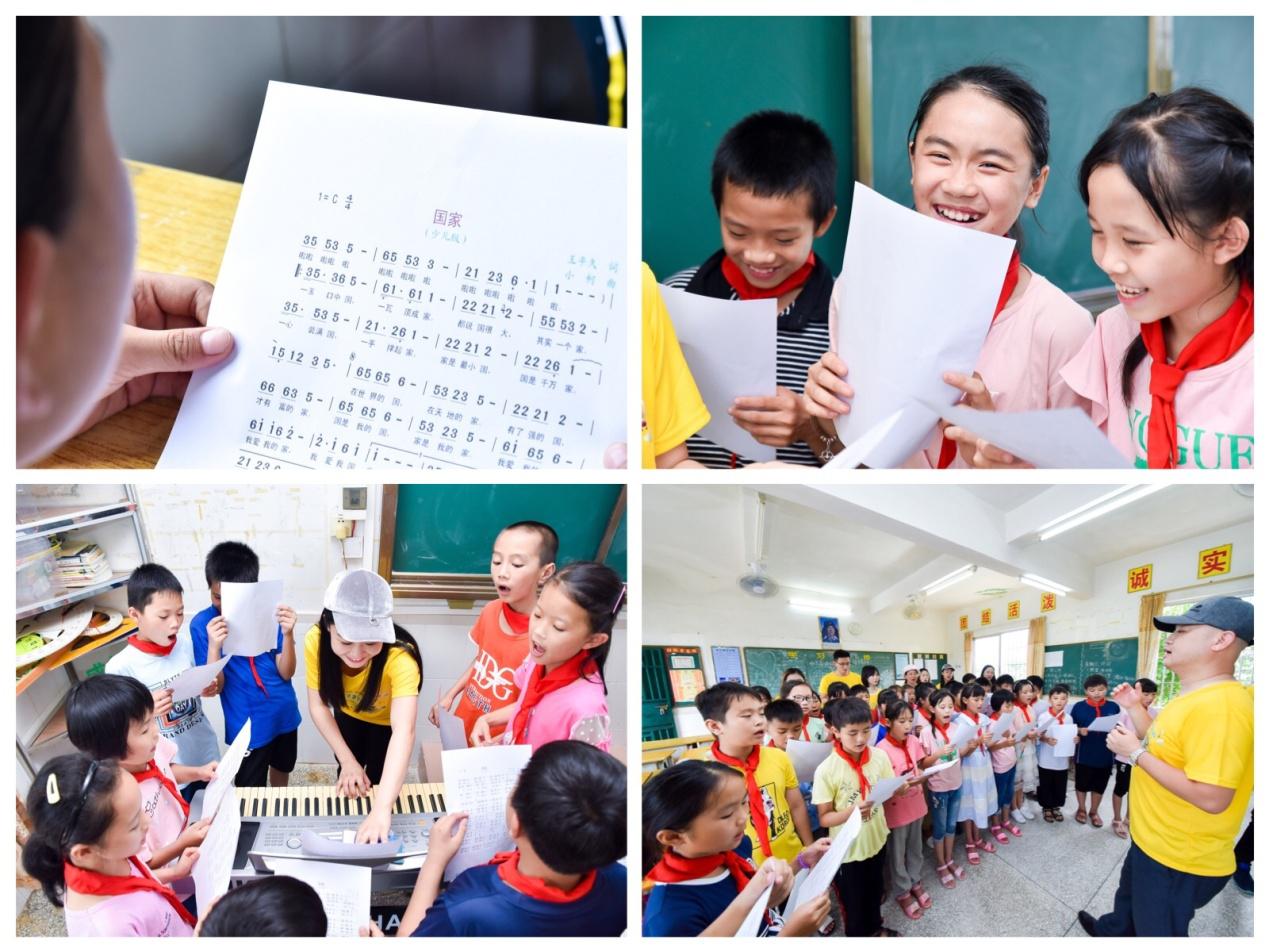 為了讓孩子們能與音樂有一次近距離的互動(dòng),此次的“藝述FUN享課”設(shè)置歌曲合唱環(huán)節(jié),孩子們被分成了不同聲部,學(xué)唱起《國家》。“有了強(qiáng)的國,才有富的家,國是我的國,家是我的家,我愛我的國,我愛我的家,我愛我國家……”在音樂老師們一詞一句耐心教學(xué)中,孩子們放下了羞澀,勇敢地開口學(xué)唱。伴隨著悠揚(yáng)琴聲音,孩子們開始有模有樣地唱了起來,他們的第一個(gè)合唱“作品”回蕩在校園里,讓在場的學(xué)校老師和工作人員們感到欣慰又暖心。