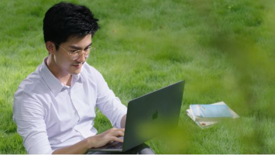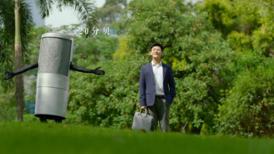 隨著主人公進(jìn)入了辦公園區(qū)內(nèi),草坪、綠蔭、風(fēng)聲、鳥語,使得主人公的心情豁然開朗,筆者也終于get到了這個(gè)廣告片所宣傳的產(chǎn)品:一個(gè)環(huán)境優(yōu)美、綠植滿園的工作目的地。