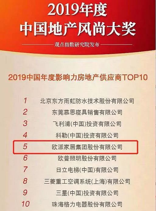 歐派集團經(jīng)過權威評委團層層指標篩選入圍風尚大獎之2019中國年度影響力房地產(chǎn)供應商TOP10