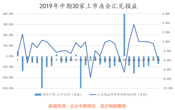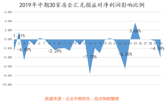 以個體來說,去年上半年,有個別房企匯兌損失為1.09億元,其凈利潤僅為5.74億元,換句話說,匯兌損失對其凈利潤的影響比率達到18.99%,而今年上半年其該指標有明顯好轉(zhuǎn),為4.04%。在30家房企中,匯兌損失對其凈利潤影響比例最大的達到7.7%。