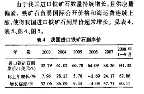 下圖來自《金屬礦山》2009年第1期,中國鋼鐵工業(yè)協(xié)會發(fā)表的文章里面的數(shù)據(jù),可以看出我國鐵礦石到岸價格從2003年之后出現(xiàn)了超常規(guī)的大幅度增長。2003年還是32.79美元,2008年1-9月就超過了140美元。