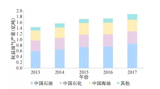 能源部分:國家隊中國石油,中國石化,中國海洋石油,中國化工都在負責中國的石油+天然氣的戰(zhàn)略安全任務(wù),中國本土的石油天然氣產(chǎn)量在2015年達到峰值后,這幾年處于下降的狀態(tài),但是與此同時中國幾大國家隊在海外的權(quán)益油氣當量卻在不斷的上升,這是技術(shù)+工程能力換取資源的結(jié)果,下圖來自《2017年國內(nèi)外油氣行業(yè)發(fā)展報告》,2017年中石油+中石化+中海油三巨頭海外權(quán)益油氣當量超過1.8億噸,其中中石油一家公司到2018年海外權(quán)益油氣當量就達到了9800萬噸