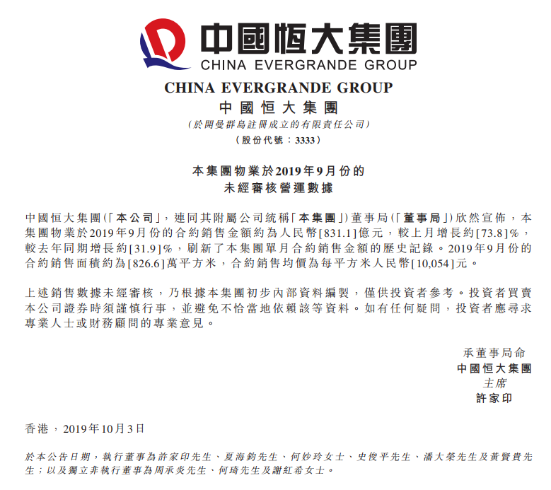 10月3日,中國恒大(HK.3333)發(fā)布月度業(yè)績公告,恒大9月銷售831.1億元,創(chuàng)公司單月銷售歷史新高,環(huán)比增長73.8%,同比增長31.9%。
