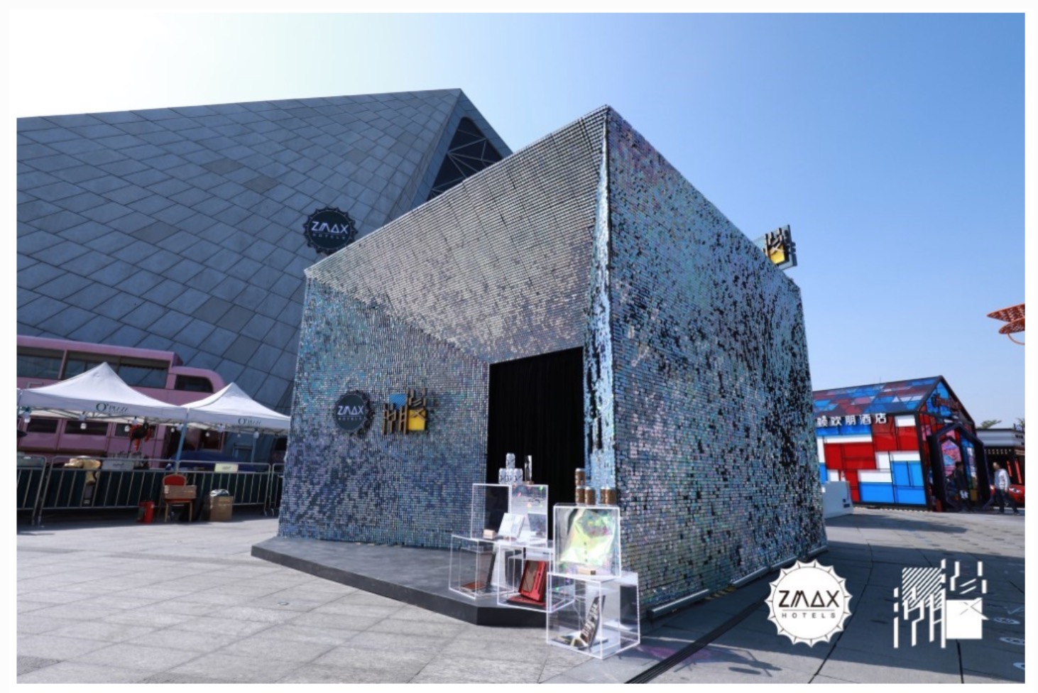 ZMAX與潮漫展館設(shè)計元素源于鏡面,展館外以數(shù)片黑色鱗片組成,陽光下散射出五彩斑斕的黑,詮釋“鏡面人生”的內(nèi)涵。ZMAX的“國風(fēng)”、“科技”和潮漫的“商務(wù)”、“休閑”,多種元素碰撞與結(jié)合,打造出獨(dú)特的空間氛圍。