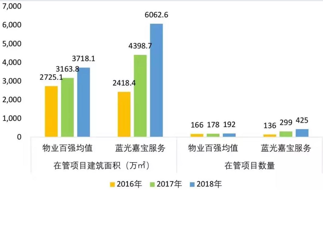 ▲物業(yè)百強與藍光嘉寶服務項目在管面積及數(shù)量對比