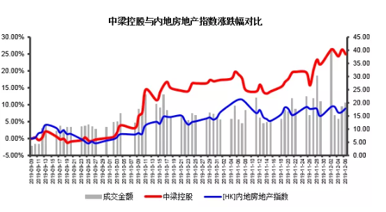 而中梁控股在內(nèi)地房地產(chǎn)企業(yè)中,憑借其自身良好的基本面自上市以來股價表現(xiàn)不俗,備受多方資本青睞。據(jù)wind統(tǒng)計,截至2019年12月6日,中梁控股報6.28港元/股,總市值為225億港元,近三個月的漲幅為26.42%,股價走勢整體好于內(nèi)房股指數(shù)。后續(xù)調(diào)入港股通后在南下資金的加持下,中梁控股股價有望進一步攀升。