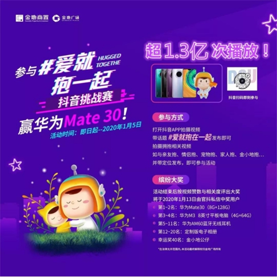情侶抱、親子抱、寵物抱、玩偶抱、金小地抱........短短半個(gè)月時(shí)間內(nèi),抖音用戶參與該話題的視頻近萬(wàn)條,播放量沖破1.3億次。而這場(chǎng)引爆抖音線上話題的挑戰(zhàn)賽活動(dòng),發(fā)起者正是2019年加速發(fā)展的商業(yè)勢(shì)力——金地商置。