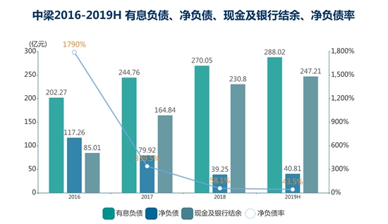 從2016年的1790%降低至2019上半年的43.5%,中梁凈負(fù)債率從最危險(xiǎn)的地方用四年回到了安全的邊界。1.7現(xiàn)金短債比以及50%的短期債務(wù)比算不上特別優(yōu)秀,但已足夠讓曾經(jīng)在天空中飛了幾年的中梁,緩緩安全落地。