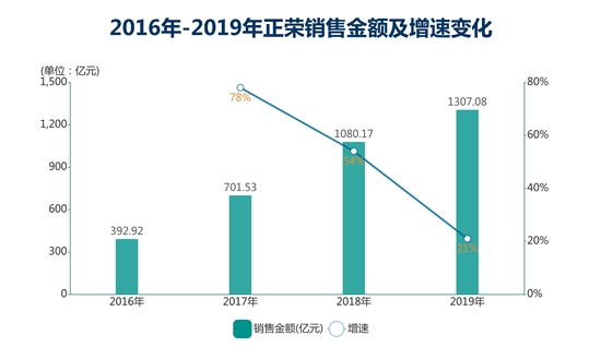 2019年,正榮地產(chǎn)宣布銷售額達到1307.08億元,完成了全年1300億目標。這是正榮連續(xù)第二年突破千億門檻,但增速已從2018年的54%下降到21%。